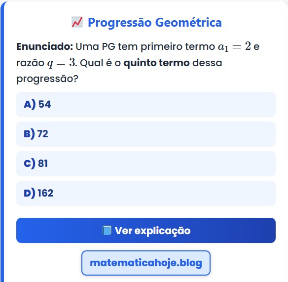 Continue lendo📈 Progressão Geométrica Enunciado: Uma PG tem primeiro termo \(a_1 = 2\) e razão \(q = 3\). Qual é o