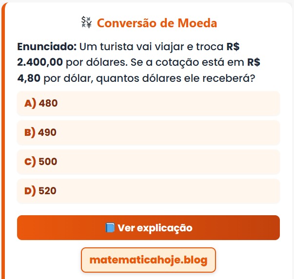 Continue lendo💱 Conversão de Moeda Enunciado: Um turista vai viajar e troca R$ 2.400,00 por dólares. Se a cotação está em