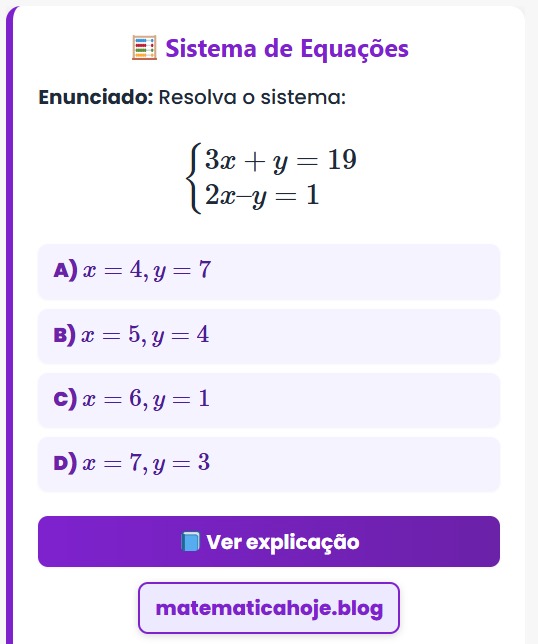 Continue lendo🧮 Sistema de Equações Enunciado: Resolva o sistema: \[ \begin{cases} 3x + y = 19 \\ 2x – y =