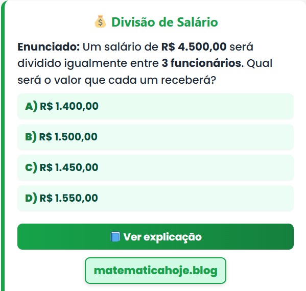 💰 Divisão de Salário Enunciado: Um salário de R$ 4.500,00 será dividido igualmente entre 3 funcionários. Qual será o valor