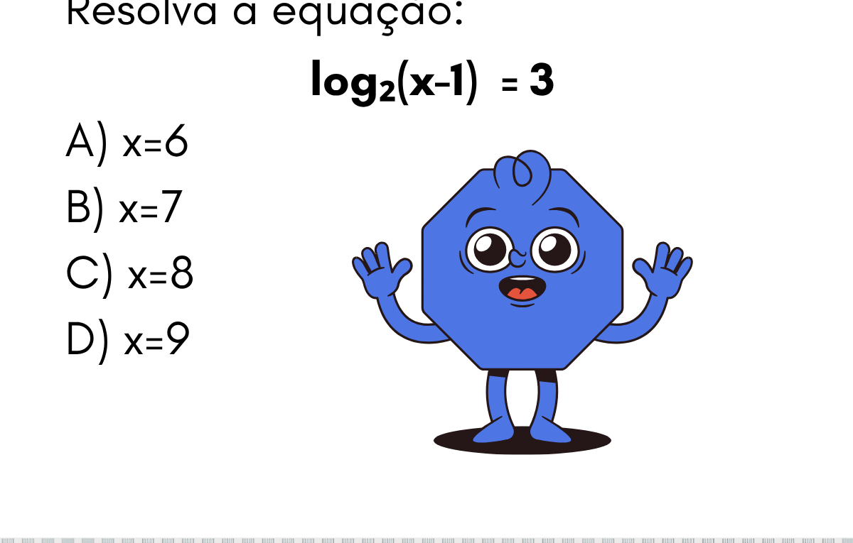 Continue lendo🔢 Equação Logarítmica — log₂(x − 1) = 3 Resolva a equação: \( \log_2(x – 1) = 3 \) A)