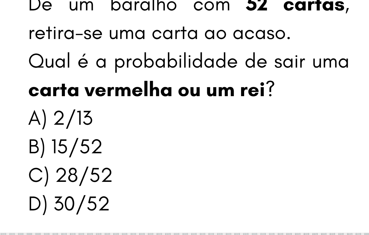 Continue lendo🃏 Probabilidade — Carta vermelha OU rei De um baralho com 52 cartas, retira-se uma carta ao acaso. Qual é