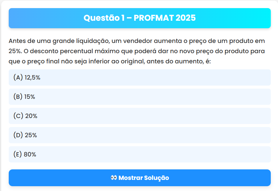 Continue lendoPROFMAT 2025 – Questão 1 PROFMAT 2025 – Questão 1 | Porcentagem e Desconto Máximo Antes de uma grande liquidação,