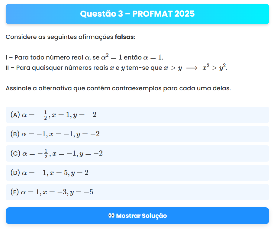 PROFMAT 2025 – Questão 3 | Contraexemplos PROFMAT 2025 – Questão 3 | Contraexemplos Considere as seguintes afirmações falsas: I