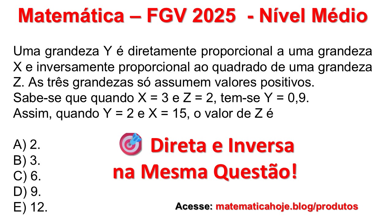 Continue lendoProporcionalidade direta e inversa ao quadrado â FGV 2025 MatemĂĄtica â FGV 2025 â NĂvel MĂ©dio ConteĂșdo: Grandezas proporcionais A