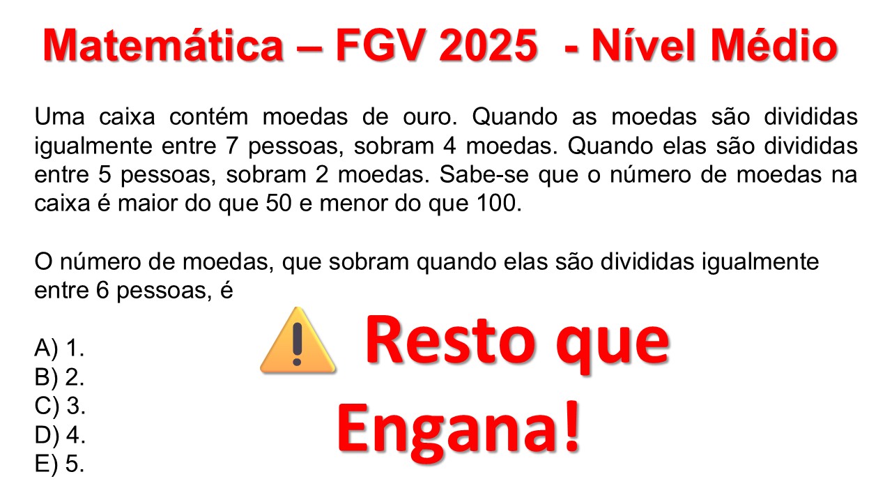 Continue lendoRestos em divisĂ”es â moedas de ouro (FGV 2025) MatemĂĄtica â FGV 2025 â NĂvel MĂ©dio ConteĂșdo: AritmĂ©tica â DivisĂ”es