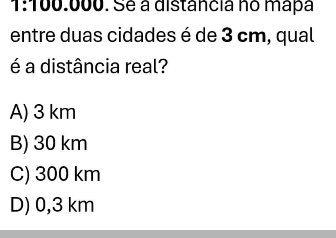 Clique aqui para ver a solução Escala: \(1 : 100.000\) Isso significa que: 1 cm no mapa = 100.000 cm