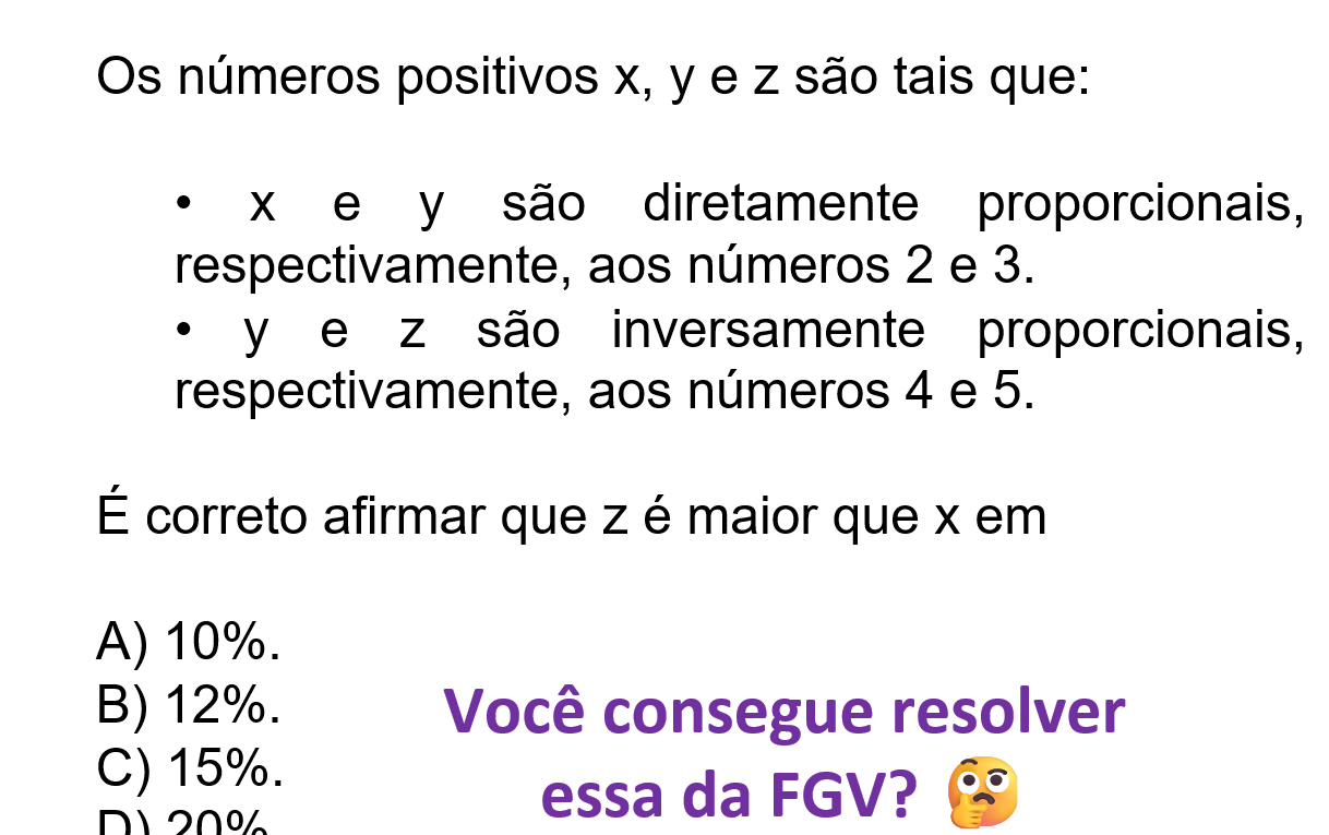 Continue lendoProporcionalidade direta e inversa â FGV 2025 MatemĂĄtica â FGV 2025 â NĂvel MĂ©dio ConteĂșdo: Proporcionalidade direta e inversa Os
