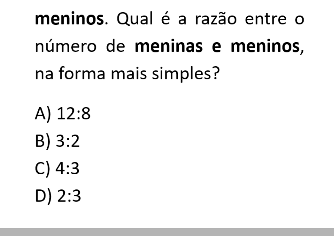 Continue lendoClique aqui para ver a solução Temos: 12 meninas 8 meninos A razão entre meninas e meninos é: \[ 12:8