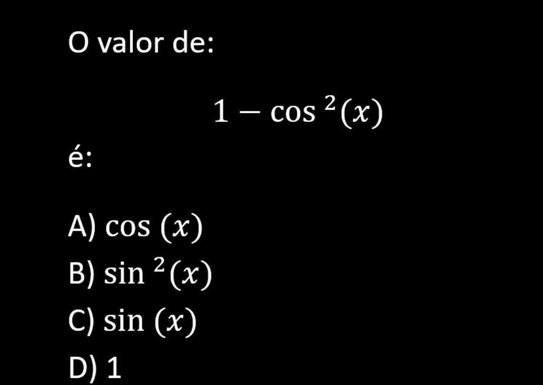Ver solução completa 1 – Identidade fundamental: senÂČ(x) + cosÂČ(x) = 1 2 – Isolando o termo desejado: senÂČ(x) =