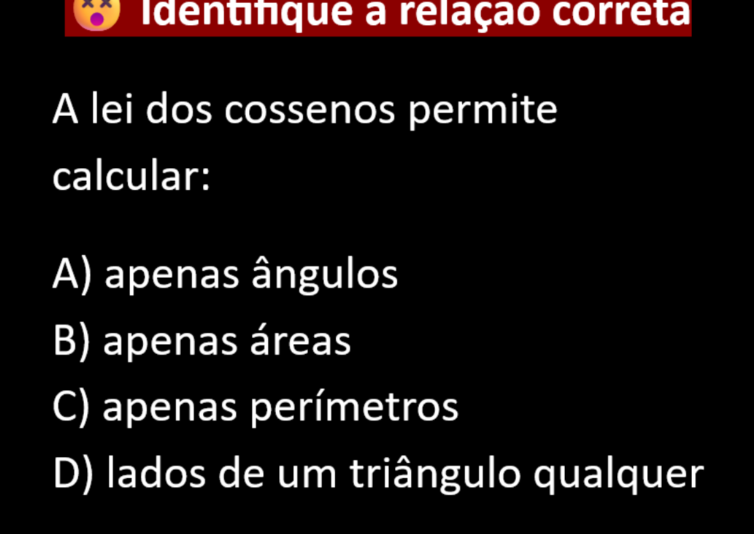 Continue lendoVer solução completa 1 – Entendendo o conceito: A Lei dos Cossenos Ă© usada em triĂąngulos quaisquer. 2 – O