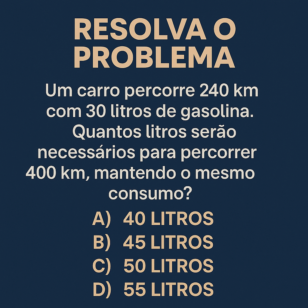 Continue lendoRegra de Três Enunciado: Um carro percorre 240 km com 30 litros de gasolina. Quantos litros serão necessários para percorrer