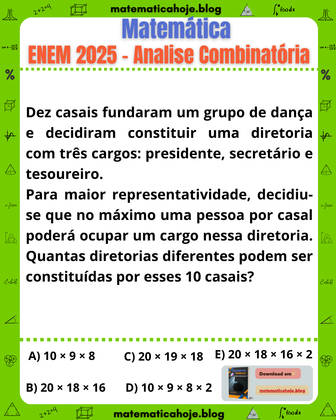 Nesta questão do ENEM 2025, 10 casais fundaram um grupo de dança e decidiram formar uma diretoria com três cargos diferentes: presidente, secretário e tesoureiro.