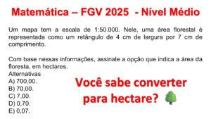 Um mapa tem escala 1:50.000. Nele, uma área florestal é representada por um retângulo de 4 cm de largura por 7 cm de comprimento.