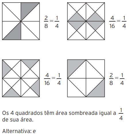 Quantos desses quadrados têm área sombreada igual a 1/4 de sua área?