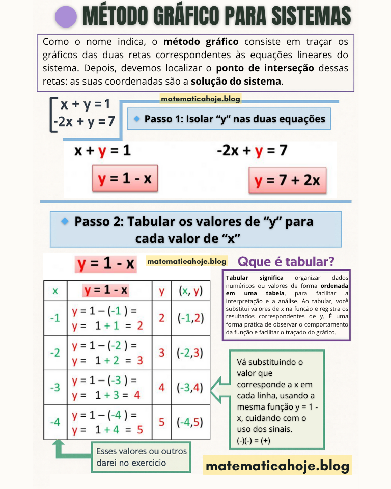 Entenda como resolver sistemas lineares pelo método gráfico: isolar y, tabular valores, traçar as retas e encontrar o ponto de interseção. Conteúdo com exemplos resolvidos e exercícios (discursivos e de múltipla escolha).