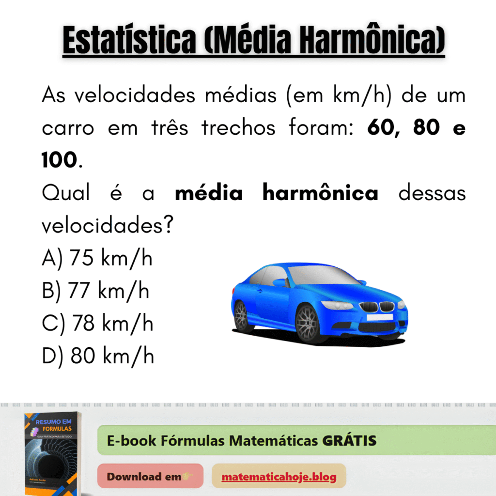 🚗 Médias — Média Harmônica de Velocidades As velocidades médias (em km/h) de um carro em três trechos foram: 60, 80