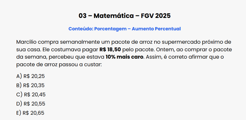 FGV 2025 Matemática: Aumento de 10% no Preço (Questão 03 Resolvida)