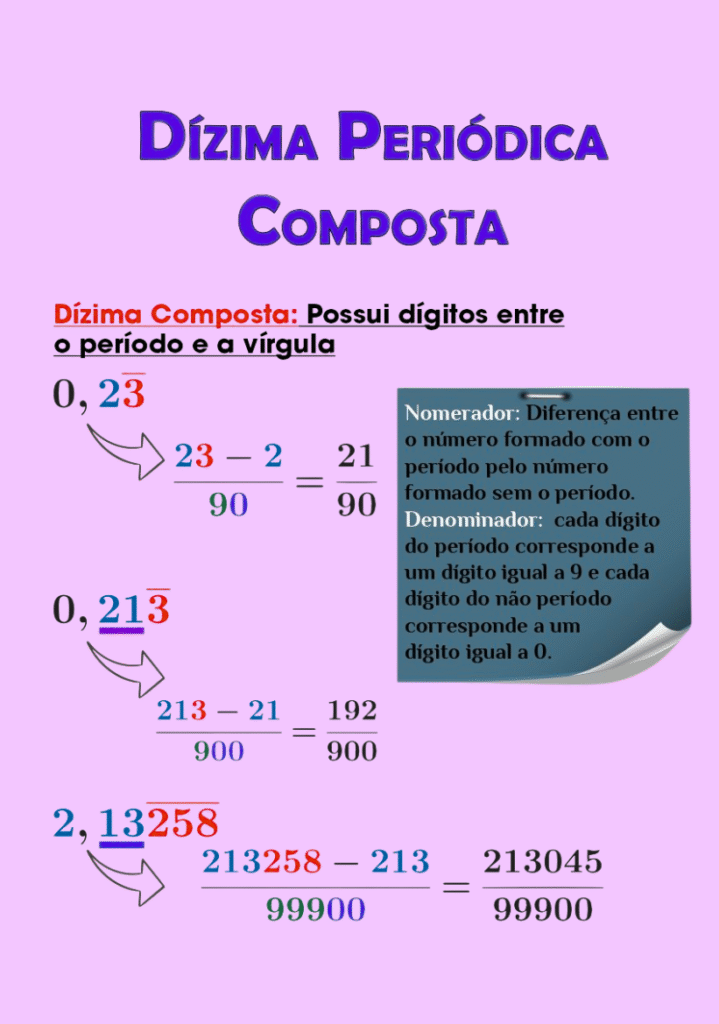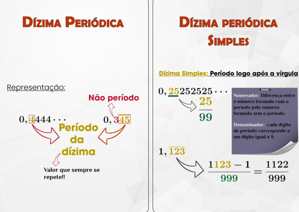 Dízima Periódica: definição, tipos (simples e composta), conversão em fração, exemplos e exercícios Dízima Periódica — como identificar, classificar e converter