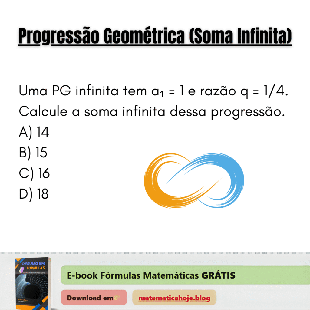 📐 Progressão Geométrica Infinita — Soma dos Termos Uma PG infinita tem \(a_1 = 1\) e razão \(q = \dfrac{1}{4}\). Calcule