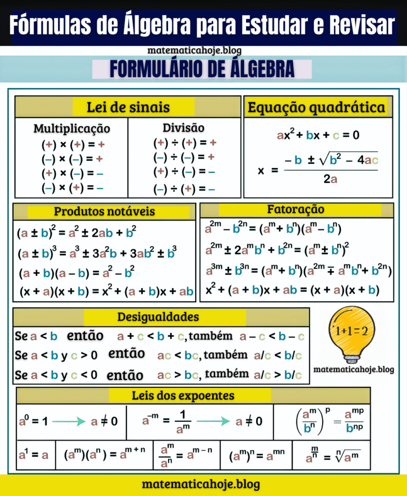 Formulário de Álgebra — Regras, Fórmulas, Exemplos e Exercícios Formulário de Álgebra — Regras, Fórmulas, Exemplos e Exercícios Revisão rápida e