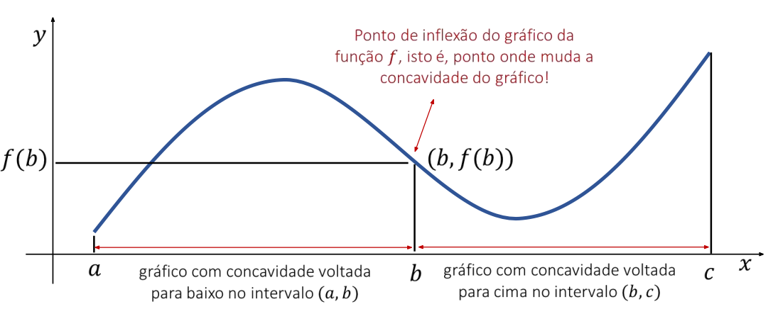 Um ponto de inflexão é um ponto do gráfico de \(y=f(x)\) onde há mudança de concavidade — de côncavo para cima para côncavo para baixo, ou vice-versa. A ferramenta principal para detectá-los é a segunda derivada.
