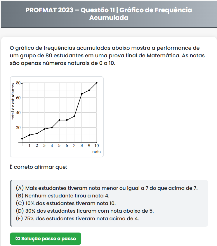 Continue lendoPROFMAT 2023 – Questão 11 PROFMAT 2023 – Questão 11 | Gráfico de Frequência Acumulada O gráfico de frequências acumuladas