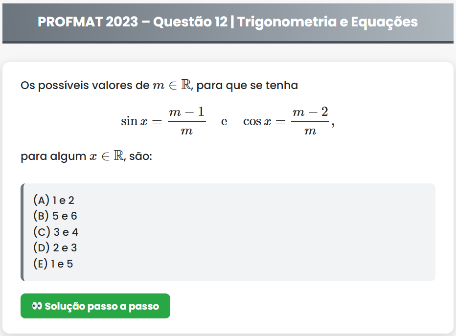 Continue lendoPROFMAT 2023 – Questão 12 PROFMAT 2023 – Questão 12 | Trigonometria e Equações Os possíveis valores de \( m