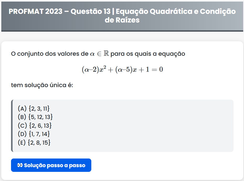 Continue lendoPROFMAT 2023 – Questão 13 PROFMAT 2023 – Questão 13 | Equação Quadrática e Condição de Raízes O conjunto dos