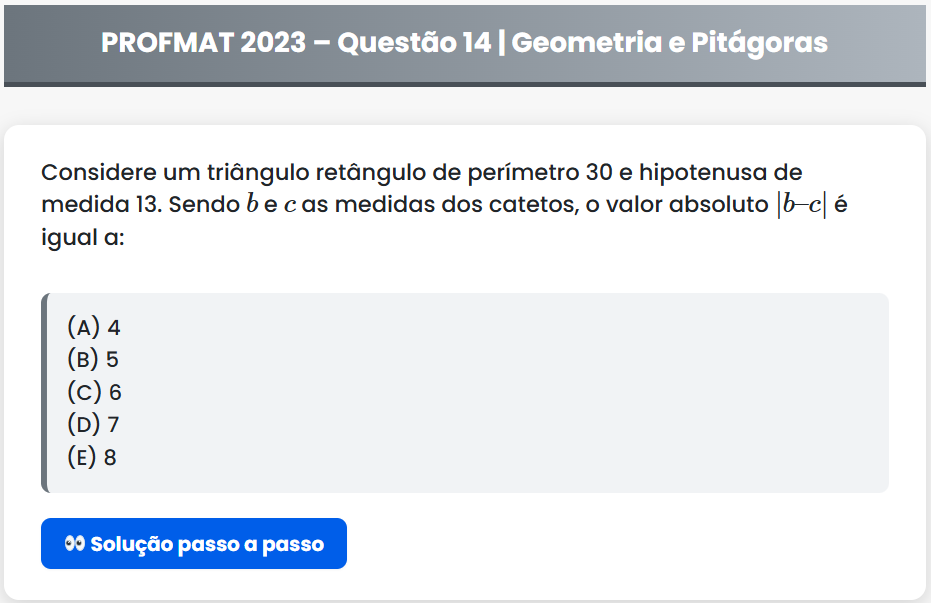 Continue lendoPROFMAT 2023 – Questão 14 PROFMAT 2023 – Questão 14 | Geometria e Pitágoras Considere um triângulo retângulo de perímetro