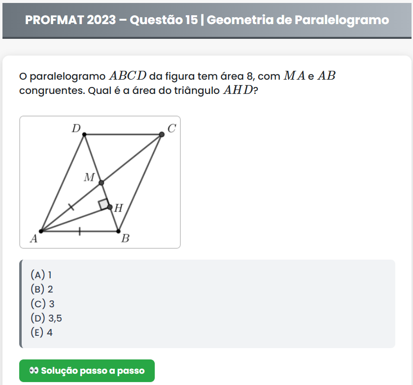 Continue lendoPROFMAT 2023 – Questão 15 PROFMAT 2023 – Questão 15 | Geometria de Paralelogramo O paralelogramo \(ABCD\) da figura tem