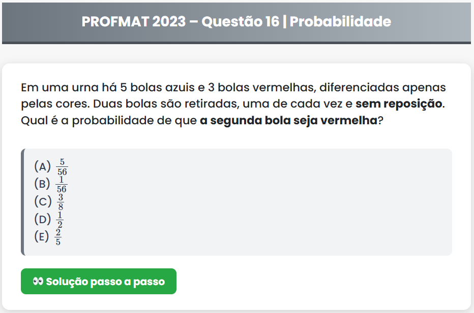 Continue lendoPROFMAT 2023 – Questão 16 PROFMAT 2023 – Questão 16 | Probabilidade Em uma urna há 5 bolas azuis e