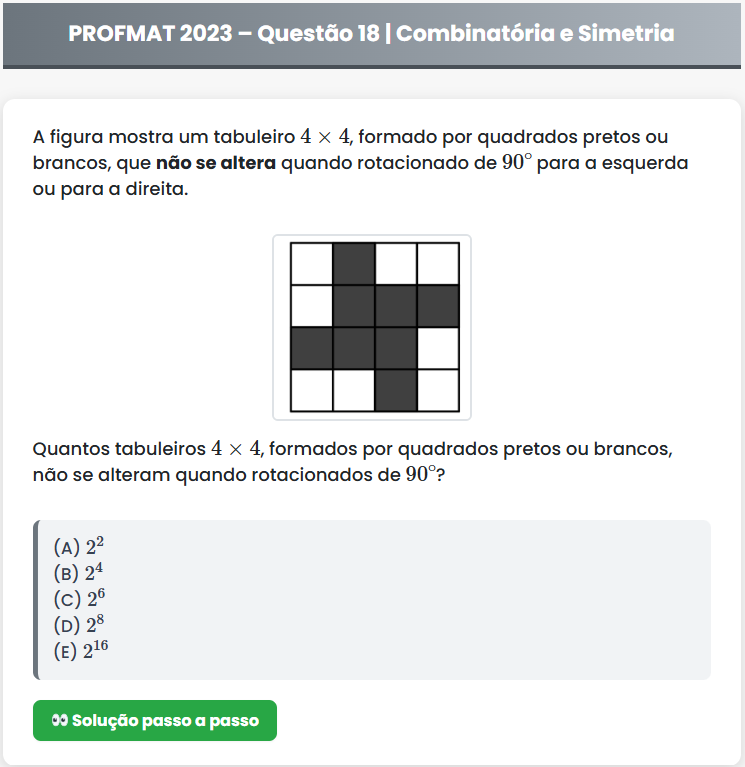 Continue lendoPROFMAT 2023 – Questão 18 PROFMAT 2023 – Questão 18 | Combinatória e Simetria A figura mostra um tabuleiro \(