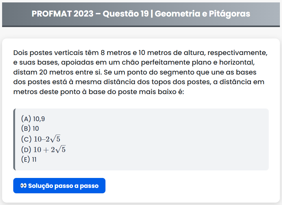 Continue lendoPROFMAT 2023 – Questão 19 PROFMAT 2023 – Questão 19 | Geometria e Pitágoras Dois postes verticais têm 8 metros