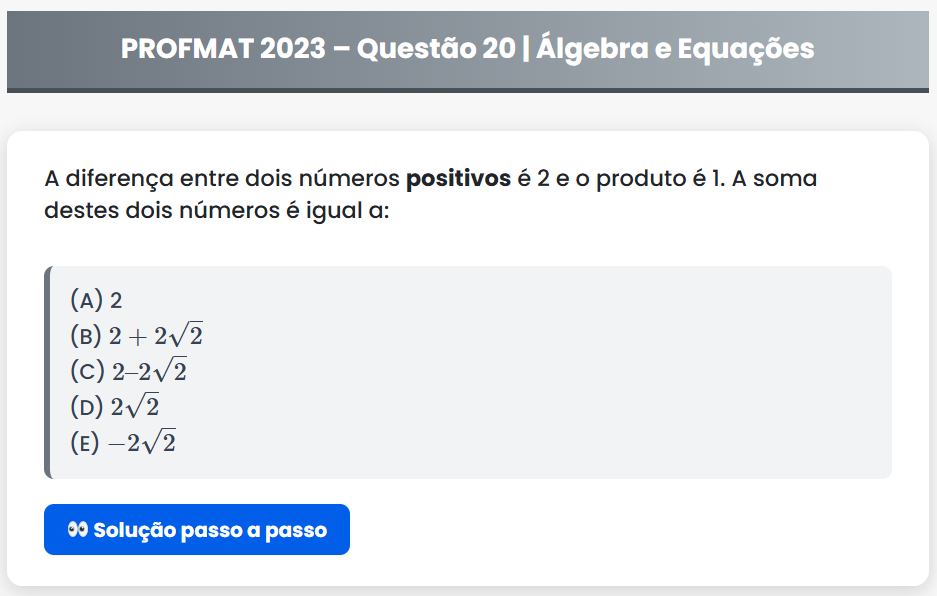 Continue lendoPROFMAT 2023 – Questão 20 PROFMAT 2023 – Questão 20 | Álgebra e Equações A diferença entre dois números positivos