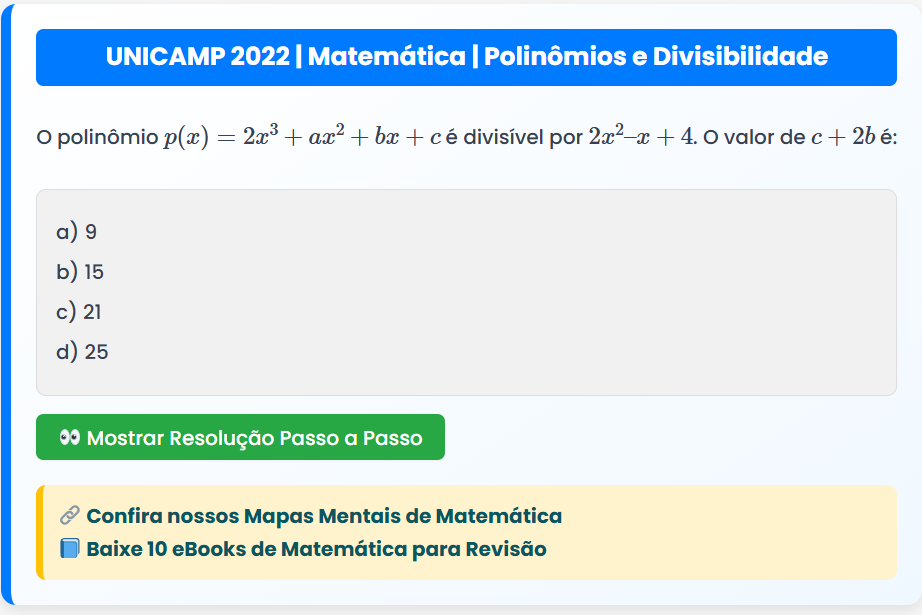 Continue lendoUNICAMP 2022 | Matemática | Polinômios e Divisibilidade UNICAMP 2022 | Matemática | Polinômios e Divisibilidade O polinômio \( p(x)