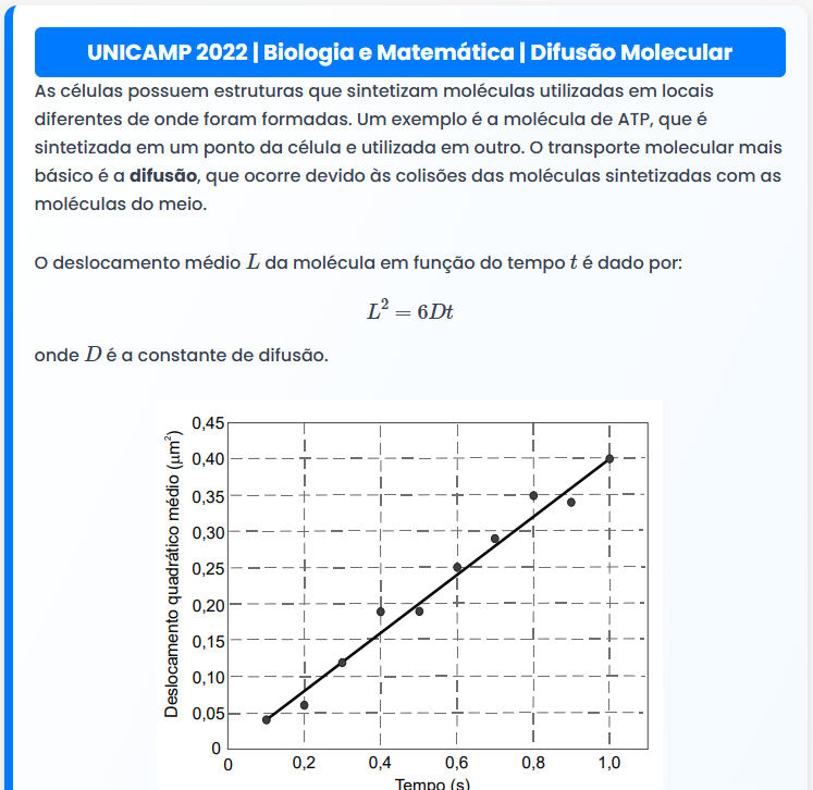 Continue lendoUNICAMP 2022 | Biologia e Matemática | Difusão Molecular UNICAMP 2022 | Biologia e Matemática | Difusão Molecular As células