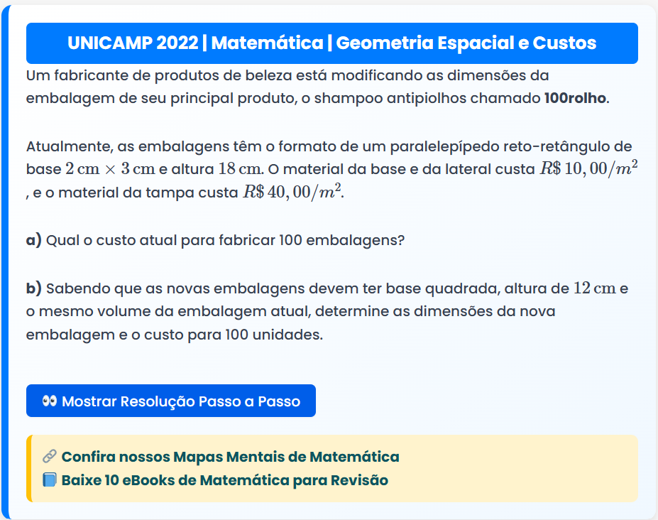 Continue lendoUNICAMP 2022 | Matemática | Geometria Espacial e Custos UNICAMP 2022 | Matemática | Geometria Espacial e Custos Um fabricante