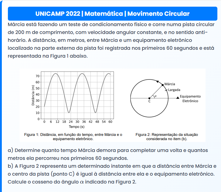 Continue lendoUNICAMP 2022 | Matemática | Movimento Circular UNICAMP 2022 | Matemática | Movimento Circular Márcia está fazendo um teste de