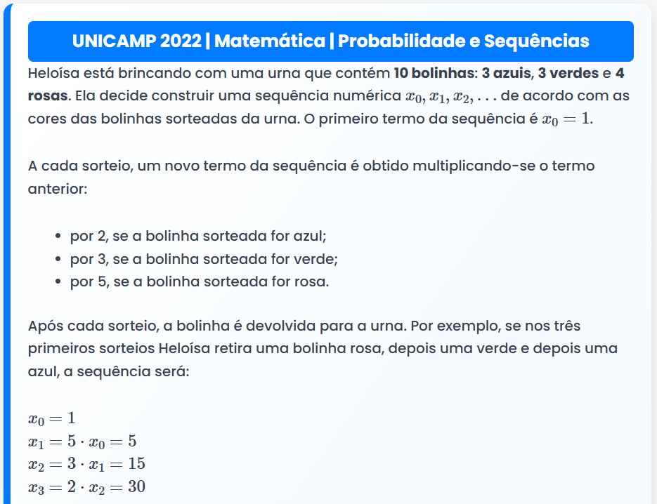 Continue lendoUNICAMP 2022 | Matemática | Probabilidade e Sequências UNICAMP 2022 | Matemática | Probabilidade e Sequências Heloísa está brincando com