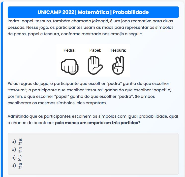 UNICAMP 2022 | Matemática | Probabilidade UNICAMP 2022 | Matemática | Probabilidade Pedra-papel-tesoura, também chamado jokenpô, é um jogo recreativo