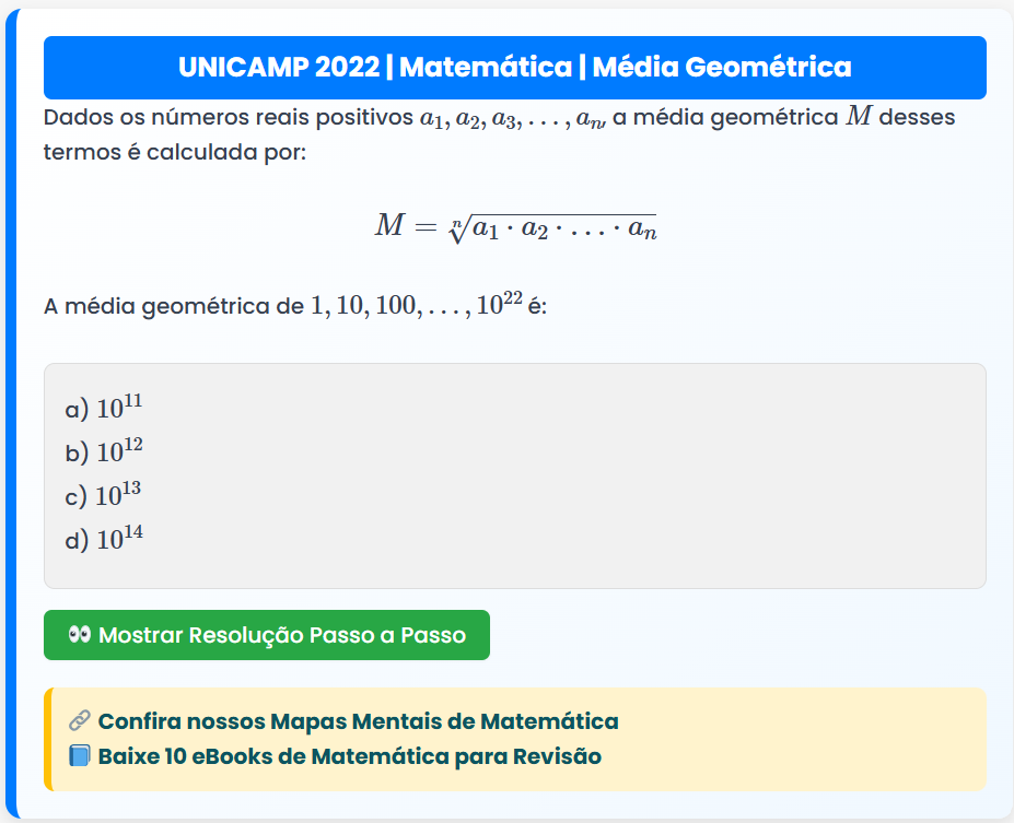 Continue lendoUNICAMP 2025 | Matemática | Média Geométrica UNICAMP 2022 | Matemática | Média Geométrica Dados os números reais positivos \(