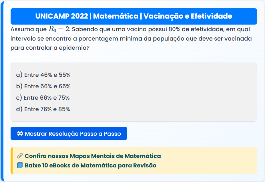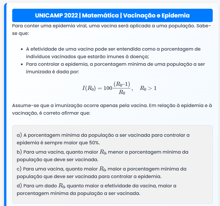 Continue lendoUNICAMP 2022 | Matemática | Vacinação e Epidemia UNICAMP 2022 | Matemática | Vacinação e Epidemia Para conter uma epidemia