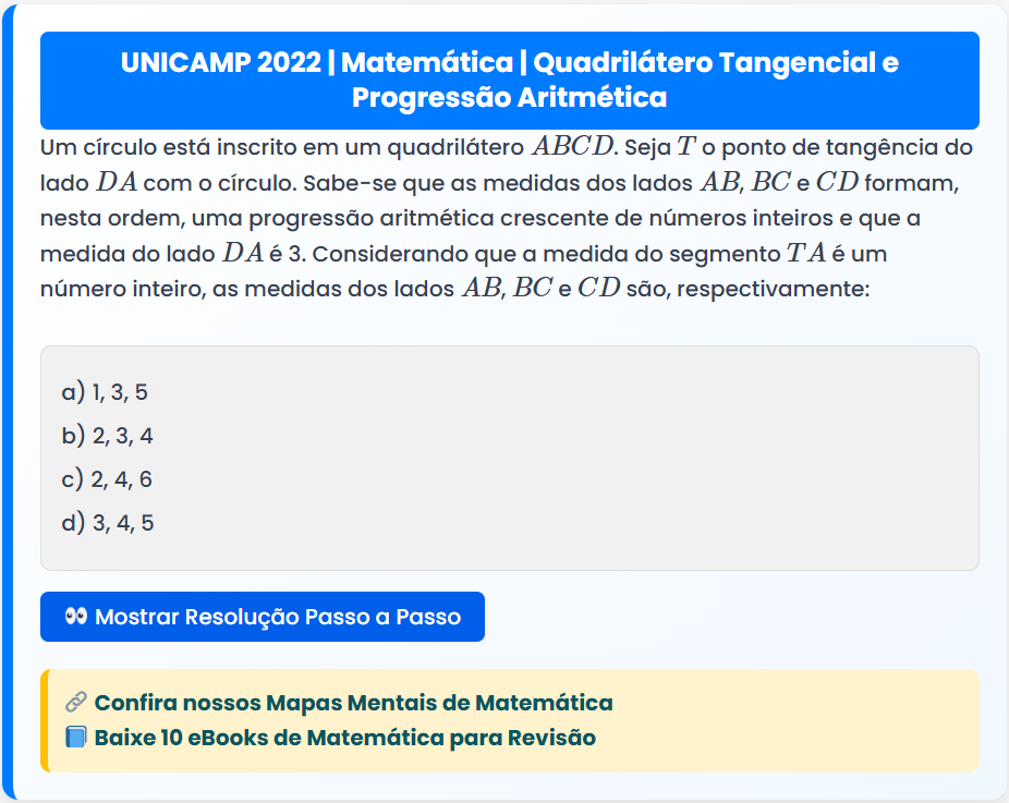 Continue lendoUNICAMP 2022 | Matemática | Quadrilátero Tangencial e Progressão Aritmética UNICAMP 2022 | Matemática | Quadrilátero Tangencial e Progressão Aritmética