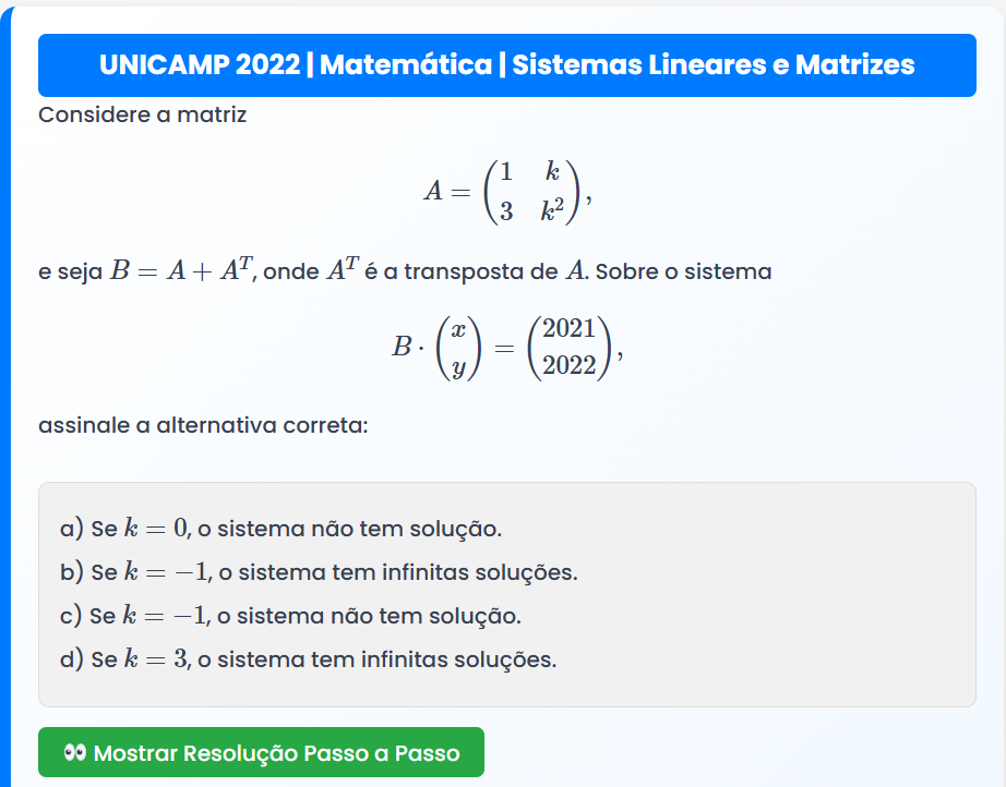 Continue lendoUNICAMP 2022 | Matemática | Sistemas Lineares e Matrizes UNICAMP 2022 | Matemática | Sistemas Lineares e Matrizes Considere a