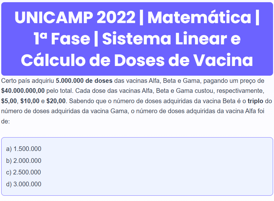 Continue lendoUNICAMP 2022 | Matemática | 1ª Fase | Sistema Linear e Cálculo de Doses de Vacina Certo país adquiriu 5.000.000