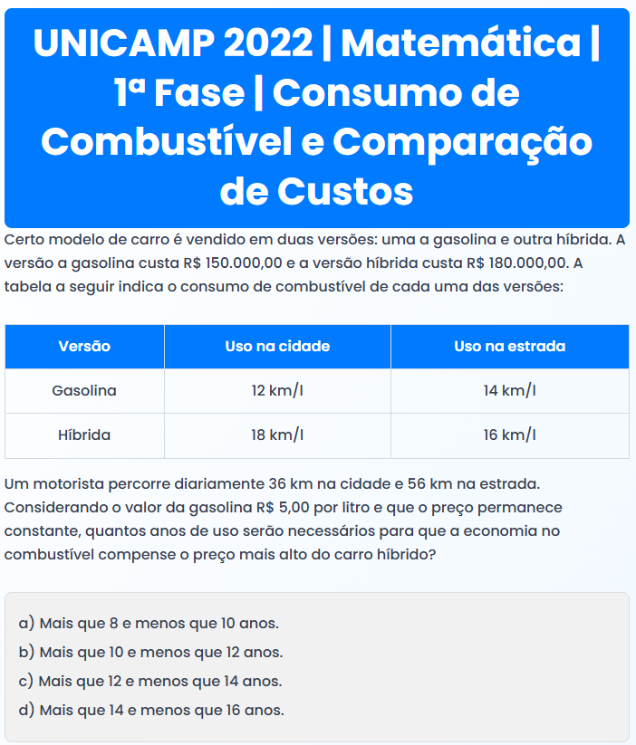 Continue lendoUNICAMP 2022 | Matemática | 1ª Fase | Consumo de Combustível e Comparação de Custos UNICAMP 2022 | Matemática |
