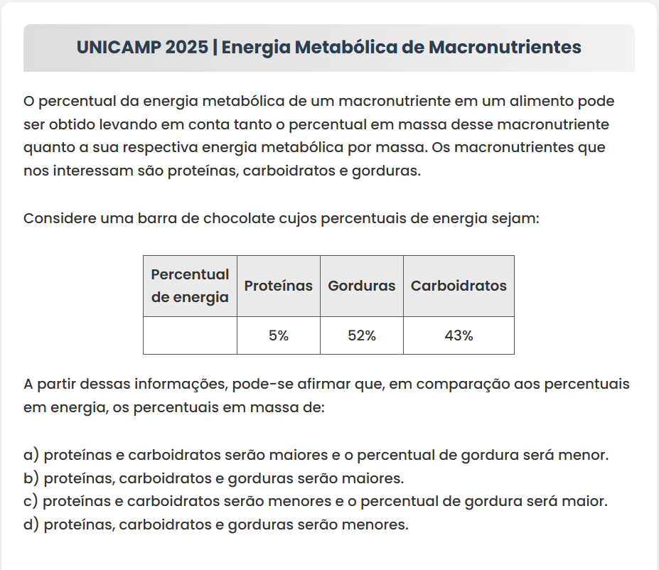 Continue lendoUNICAMP 2025 | Matemática | 1ª Fase | Energia Metabólica de Macronutrientes UNICAMP 2025 | Matemática | 1ª Fase |