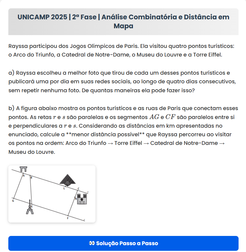 Continue lendoUNICAMP 2025 | Matemática | 2ª Fase | Análise Combinatória e Distância em Mapa UNICAMP 2025 | Matemática | 2ª