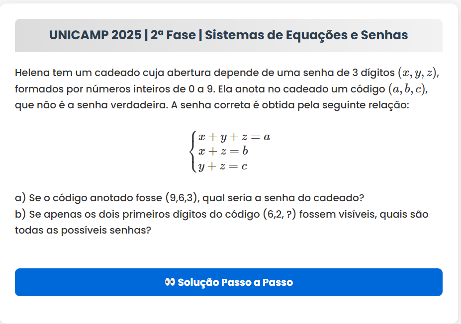 Continue lendoUNICAMP 2025 | Matemática | 2ª Fase | Sistemas de Equações e Senhas UNICAMP 2025 | Matemática | 2ª Fase